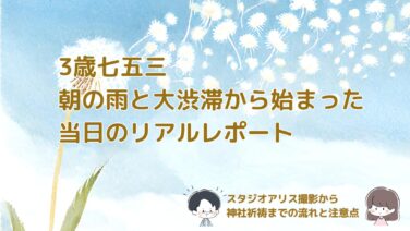 子育て スタジオアリス撮影から神社祈祷まで|3歳七五三“リアル当日レポ”と気をつけたいこと 3歳七五三の当日レポです。スタジオアリス撮影、渋滞トラブル、昼食問題、神社祈祷までの流れをまとめました。実際に大変だったポイントや、やってよかった準備、注意したいことをリアルに記録しています。 2025.11.29 子育て